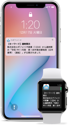 「株主優待」「株式分割」「立会外分売」「決算説明会」「公募増資」「第三者割当増資」「招集通知」「パイプライン」「業績予想の修正」など様々なキーワードを登録することで、キーワードに合致した適時開示情報のお知らせを受信します。Apple Watchの通知機能にも対応しております。